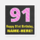 This joyful and fun birthday-themed paper napkin design features a large number "91" having a light pink and dark pink striped pattern containing heart shapes. It also features the birthday greeting message "Happy 91st Birthday,", and a personalised name. Paper napkins like this might be nice to have at a party being held in honour of somebody’s 91st birthday. It might also be a fun choice for somebody who has a birthday that falls on February 14 (Valentine's Day), due to its loving heart symbols and colours. [~Z0000436]