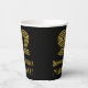 This vintage style and 1920s/1930s style inspired birthday-themed paper cup design features a large art deco inspired look number “92”, plus the birthday greeting message “Happy 92nd Birthday,” and a personalised name. The background is coloured black. Birthday themed paper cups like this might be used at a party celebrating somebody’s 92nd birthday. [~Z0000546]