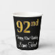 This luxurious, elegant, and sophisticated birthday paper cup design features a large ordinal number “92nd” having a faux/imitation gold-inspired look, in addition to the birthday greeting message “Happy 92nd Birthday,” and a personalised name in a script-style font. The background is coloured black. Sophisticated birthday themed paper cups like this might be used at a birthday party celebrating somebody’s 92nd birthday. [~Z0000538]