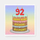 This colourful and upbeat birthday themed paper napkin design features a cartoon-style depiction of a three-tier birthday cake having number-shaped candles on top showing the age “92“, along with the message “HAPPY 92ND BIRTHDAY,”, and a customisable recipient name. The background has a multicolored pastel rainbow spectrum inspired gradient pattern. Cheerful birthday themed paper napkins like these might be used at a party for somebody who is celebrating their 92nd birthday. [~Z0000623]