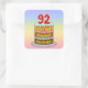 This fun and cheerful birthday square sticker design features a cartoon-style depiction of a three-tier birthday cake having numeral-shaped candles on top showing the number “92“, along with the message “HAPPY 92ND BIRTHDAY,”, and a customisable recipient name. The background features a multi-colour pastel rainbow spectrum inspired gradient pattern. Joyful birthday themed stickers like these might be distributed or used at a party celebrating somebody’s 92nd birthday, or perhaps used when preparing gifts/presents or invitations for such an event. [~Z0000624]