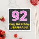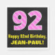 This joyful and fun birthday themed paper napkin design features a large number "92" having a striped pattern containing heart shapes coloured light pink and dark pink. It also features the birthday greeting message "Happy 92nd Birthday,", and a custom name. Paper napkins like this might be nice to have at a party being held to celebrate somebody’s ninety second birthday. It might also be a fun choice for somebody whose birthday falls on Valentine's Day (February 14), due to its loving heart symbols and colours. [~Z0000436]