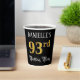 This ornate and opulent birthday paper cup design features a customizable name and the message “93rd Birthday Party”. The large number “93rd” has an imitation/faux gold-inspired coloring pattern, the words “Birthday Party” are in fancy script-style text, and the background is colored black by default (although it can be customized). Luxurious, elegant paper cups like this might be used at a birthday celebration/party being held in celebration of somebody’s ninety third birthday. [~Z0000567]