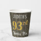 This fancy and opulent birthday themed paper cup design features a personalised name and the message “93rd Birthday Party”. The large number “93rd” has a faux/imitation gold-inspired colouring pattern, the words “Birthday Party” are in luxurious script-style text, and the background features an imitation/faux woodgrain-inspired look. Ornate, elegant paper cups like this might be useful to have at a birthday celebration/party being held to honour somebody’s 93rd birthday. [~Z0000568]