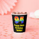 This exciting and fun birthday themed paper cup design features a large number “94” having a rainbow spectrum gradient inspired pattern. It also features the message “Happy 94th Birthday,”, and a custom name. It also has a black-coloured background. Vibrant, colourful paper cups like this might be fun to have at a birthday party/celebration being held to celebrate somebody’s 94th birthday. [~Z0000537]