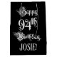 This opulent and ornate birthday gift bag design features the message “Happy 94th Birthday,” in fancy script style text, on a black coloured background. It also has a custom recipient name. A formal birthday themed gift bag like this might be a respectable way to wrap a gift or present being given to somebody who is celebrating their 94th birthday. [~Z0000557]