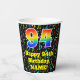 This exciting and joyful music-themed birthday paper cup design features a large number “94” with a rainbow spectrum gradient inspired pattern, along with the message “Happy 94th Birthday,”, and a personalised name. The background features a vibrant and colourful pattern having music notes and symbols of various sizes and colours. Colourful, vibrant paper cups like this might be fun to have at a birthday celebration/party being held to honour somebody’s 94th birthday. [~Z0000541]