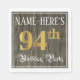 This fancy and ornate birthday themed paper napkin design features a custom name and the message “94th Birthday Party”. The large number “94th” has a faux/imitation gold-inspired colouring pattern, the words “Birthday Party” are in opulent script-style text, and the background has an imitation/faux woodgrain-inspired pattern. Luxurious, opulent paper napkins like this might be useful to have at a birthday celebration being held to celebrate somebody’s 94th birthday. [~Z0000566]