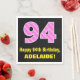 This fun and joyful birthday themed paper napkin design features a large number "94" having a dark pink and light pink striped pattern containing heart shapes. It also features the birthday greeting message "Happy 94th Birthday,", and a customisable name. Paper napkins like this might be nice to have at a party being held to celebrate somebody’s 94th birthday. It might also be a fun choice for somebody whose birthday falls on Valentine's Day (February 14th), due to its loving heart symbols and colours. [~Z0000436]