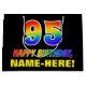 This cheerful, colourful, and fun birthday-themed gift bag design features a large number "95" and the message "HAPPY BIRTHDAY,", both coloured with a rainbow spectrum gradient inspired pattern, along with a bold yellow editable recipient name. The background is coloured black. A fun gift bag like this might be used when giving a gift or present in honour of somebody’s 95th birthday. [~Z0000477]