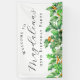 Elegant winter watercolor green holly sprigs create a beautiful holiday greenery border at the bottom of this birthday party welcome banner, green holly is the December birth flower. A trendy font combination gives it a modern vibe. All of the text is editable.
