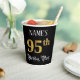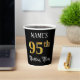 This opulent and fancy birthday-themed paper cup design features a personalized name and the message “95th Birthday Party”. The large number “95th” has a faux/imitation gold-inspired coloring pattern, and the words “Birthday Party” are in luxurious script-style text. The background is colored black by default (although it can be customized). Luxurious, elegant paper cups like this might be useful at a birthday party/celebration being held to celebrate somebody’s 95th birthday. [~Z0000567]