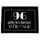This vintage appearance 1920s/1930s style inspired birthday-themed gift bag design features a large art deco look inspired number "96", the message "Happy 96th Birthday,", an editable name, and a border pattern consisting of thin lines. The background is coloured black. A gift bag like this might be used when wrapping presents being given to somebody in celebration of their ninety sixth birthday. [~Z0000496]
