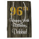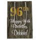 This elegant, stylish, and sophisticated birthday gift bag design features a large ordinal number “96th” having an imitation/faux gold-inspired appearance, along with the birthday greeting message “Happy 96th Birthday,” and a personalised recipient name in a script-style font. The background has a faux wood-inspired pattern. A luxurious gift-bag like this might be used when wrapping presents being given to somebody in celebration of their ninety sixth birthday. [~Z0000520]