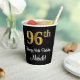 This luxurious, sophisticated, and stylish birthday-themed paper cup design features a large ordinal number “96th” having an imitation/faux gold-inspired appearance, plus the birthday greeting message “Happy 96th Birthday,” and a custom name in a script-style font. It also has a black-coloured background. Paper cups like this might be used at a birthday party held in celebration of somebody’s ninety sixth birthday. [~Z0000538]