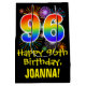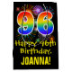 This fun, exciting, and colourful birthday themed giftbag design features a large number "96" with a rainbow spectrum gradient style pattern, along with the message "Happy 96th Birthday,", and a customisable recipient name. It also has a colourful bursting celebratory fireworks inspired background pattern. A birthday themed gift bag like this might be a fun way to wrap a gift or present being given to somebody who is celebrating their ninety sixth birthday. [~Z0000509]