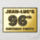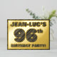 The front of this bold ninety-sixth birthday party/celebration foil invitation card features an editable name, a large number “96th”, the message “BIRTHDAY PARTY!”, and a border, all featuring a rustic, yet elegant, faux wood grain appearance inspired pattern. The back features personalised details about the event, such as the date, time, location/venue, and any other information that may be relevant. Customisable invitations like these might be used to invite guests/attendees to a birthday gathering being held in celebration of somebody’s 96th birthday. [~Z0000595]