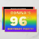 The front of this vibrant and joyful ninety-sixth birthday celebration/party foil invitation card design features an editable name, a large number “96th”, the message “BIRTHDAY PARTY!”, and a border. The background of the front has a fun, colourful, rainbow spectrum inspired gradient pattern. The back features personalised details about the event, such as the date, time, location/venue, and any other information that may be relevant. Customisable invitations like these might be a fun way to invite attendees to a birthday party/gathering being held in celebration of somebody’s 96th birthday. [~Z0000599]