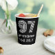 This vintage style and 1920s-1930s style inspired birthday paper cup design features a large art deco inspired appearance number “97”, in addition to the birthday greeting message “Happy 97th Birthday,” and an editable name. The background is coloured black. Birthday themed paper cups like this might be a fun way to celebrate somebody’s 97th birthday. [~Z0000542]