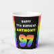 This bold and upbeat birthday paper cup design features a large number “97“ with a multicolor rainbow spectrum inspired gradient pattern, along with the message “HAPPY 97th BIRTHDAY,”, and a custom recipient name. Cheerful birthday themed paper cups like this might be used at a birthday party in celebration of somebody’s ninety seventh birthday. [~Z0000639]