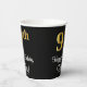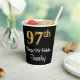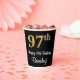 This luxurious, stylish, and sophisticated birthday-themed paper cup design features a large ordinal number “97th” having a faux/imitation gold-like look, along with the birthday greeting message “Happy 97th Birthday,” and a personalised name in a script-style font. It also has a black-coloured background. Paper cups like this might be used at a birthday party held in celebration of somebody’s 97th birthday. [~Z0000538]