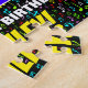 This bold and colourful birthday jigsaw puzzle design features a large number “97” having a multicolored rainbow spectrum inspired gradient pattern. It also features the message “HAPPY 97th BIRTHDAY,”, and a custom recipient name. The background has an upbeat pattern of music notes and symbols having various sizes and colours. A joyful, customised birthday puzzle like this might be given in celebration of somebody’s ninety-seventh birthday. These might be more meaningful for a music-themed birthday party. [~Z0000608]