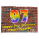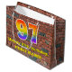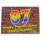 This fun and vibrant birthday-themed gift bag design, inspired by urban art and graffiti, features a large number "97" with a rainbow spectrum gradient inspired pattern, along with the message "Happy 97th Birthday,", and a personalised name. The background features a brick wall style pattern. A gift-bag like this might be used when wrapping gifts being given to somebody in celebration of their ninety seventh birthday. [~Z0000522]
