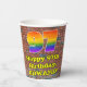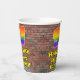 This vibrant and exciting urban street art and graffiti inspired birthday paper cup design features a large number “97” having a colourful rainbow spectrum gradient inspired pattern. It also features the message “Happy 97th Birthday,”, and a custom name. The background features a brick wall pattern. Vibrant, colourful paper cups like this might be fun to use at a birthday party/celebration being held to honour somebody’s ninety seventh birthday. [~Z0000543]