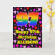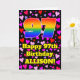 The front of this fun and joyful birthday greeting card design features a large number “97” with a rainbow spectrum gradient inspired pattern, along with the message “Happy 97th Birthday,”, and a customizable name. The background of the front features a pattern of heart shapes with colors like red, pink, and purple. The inside has an editable birthday greeting message, or could perhaps be cleared and left blank if a message is to be written by hand instead. A cheerful, customizable birthday greeting card like this might be a fun way to deliver a birthday greeting message to somebody who is celebrating their ninety-seventh birthday. [~Z0000551]