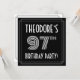 The front of this stylish and Roaring Twenties inspired ninety-seventh birthday celebration/party invitation card design features a customisable name, an intricate art deco style inspired number “97th”, the message “BIRTHDAY PARTY!”, and a multi-line border. The background of the front is coloured black by default, but it can be customised to a different colour if desired. The back features personalised details about the event, such as the date, time, place, and any other important information. Stylish, elegant, customisable invitations like these might be used to invite guests to a birthday party/gathering being held to honour somebody’s 97th birthday. [~Z0000615]