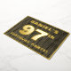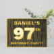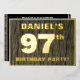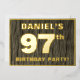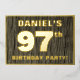 The front of this bold ninety-seventh birthday party/celebration foil invitation card features a personalised name, a large number “97th”, the message “BIRTHDAY PARTY!”, and a border, all in foil. There is a rustic, yet elegant, faux wood grain appearance inspired pattern for the background of the front. The back features personalised details about the event, such as the date, time, location, and any other important information. Customisable invitations like these might be used to invite guests to a birthday party being held in celebration of somebody’s 97th birthday. [~Z0000598]