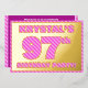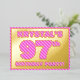 The front of this bold and fun ninety-seventh birthday party/celebration foil invitation/announcement card features a personalised name, a large number “97th”, the message “BIRTHDAY PARTY!”, and a border, all featuring a feminine light pink and dark pink striped pattern. The back features personalised details about the event, such as the date, time, venue, and any other information that may be useful. Customisable invitations like these might be used to invite guests to a birthday gathering being held to celebrate somebody’s 97th birthday. [~Z0000597]