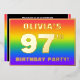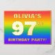 The front of this exciting ninety-seventh birthday celebration foil invitation card design features a personalised name, a large number “97th”, the message “BIRTHDAY PARTY!”, and a border. The background of the front has a fun, multicolored, rainbow spectrum inspired gradient pattern. The back features personalised details about the event, such as the date, time, location, and any other information that may be useful. Editable invitations like these might be a fun way to invite attendees/guests to a birthday party/gathering being held to celebrate somebody’s 97th birthday. [~Z0000599]