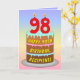 This fun and colourful birthday themed greeting card design features a cartoon-style depiction of a three-tier birthday cake having numeral-shaped candles on top showing the number “98“, along with the message “HAPPY 98TH BIRTHDAY,”, and a personalised recipient name. The background of the front has a multicolored pastel rainbow spectrum inspired gradient pattern. The inside has a customisable birthday greeting message, or could perhaps be cleared and left blank if a message is to be written by hand instead. A joyful, customisable birthday greeting card like this might be a fun way to send a birthday greeting message to somebody who is celebrating their ninety-eighth birthday. [~Z0000625]