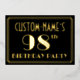 The front of this vintage-style ninety-eighth birthday party/celebration foil invitation features a customisable name, a large art deco look inspired number “98th”, the message “BIRTHDAY PARTY”, and a border pattern consisting of lines. There is a black-coloured background on the front by default, but it can be customised to a different colour if desired. The back features personalised details about the event, such as the date, time, venue, and any other information that may be important. Luxurious, elegant, editable invitations like these might be used to invite guests to a birthday party/gathering being held in celebration of somebody’s 98th birthday. [~Z0000591]