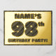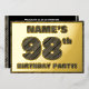 The front of this bold ninety-eighth birthday celebration/party foil invitation card features a personalised name, a large number “98th”, the message “BIRTHDAY PARTY!”, and a border, all featuring a rustic, yet elegant, faux wood grain appearance inspired pattern. The back features personalised details about the event, such as the date, time, venue, and any other information that may be relevant. Customised invitations like these might be used to invite guests/attendees to a birthday gathering/party being held to celebrate somebody’s 98th birthday. [~Z0000595]
