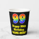 This fun and exciting birthday themed paper cup design features a large number “99” having a rainbow spectrum gradient inspired pattern. It also features the message “Happy 99th Birthday,”, and a custom name. It also has a black-coloured background. Colourful, vibrant paper cups like this might be fun to use at a birthday celebration/party being held in celebration of somebody’s 99th birthday. [~Z0000537]