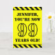 The front of this attention-grabbing and bold birthday themed greeting card design features a customizable name and the message "YOU’RE NOW 99 YEARS OLD!" in black stencil style text on a yellow colored background. There is also an eye-catching black and yellow striped pattern at the top and bottom edges of the front. The inside features a personalized birthday greeting message, or could perhaps be cleared and left blank if a message is to be written by hand instead. A personalized birthday card like this might be a fun way to acknowledge somebody’s ninety ninth birthday. [~Z0000413]