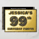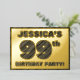 The front of this bold ninety-ninth birthday party/celebration foil invitation card features a customisable name, a large number “99th”, the message “BIRTHDAY PARTY!”, and a border, all featuring a rustic, yet elegant, faux wood grain appearance inspired pattern. The back features personalised details about the event, such as the date, time, location/venue, and any other useful information. Personalised invitations like these might be used to invite attendees/guests to a birthday gathering being held in celebration of somebody’s 99th birthday. [~Z0000595]
