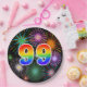 This fun, colourful, and cheerful paper plate design features a large number "99" coloured with a rainbow spectrum gradient inspired pattern. It also features a vibrant and exciting bursting celebratory fireworks inspired pattern. The background is coloured black. Paper plates like this might be used at a party celebrating somebody’s 99th birthday, a 99th anniversary, or some other ninety ninth event. [~Z0000490]