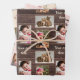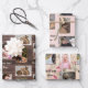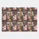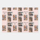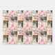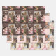 Wrapping paper sheets each featuring 3 of your custom photos. The first sheet shows a dark wood background. The second one is a pink quatrefoil pattern and the third one has a romantic vintage rose design. Perfect to suit a variety of different occasions.