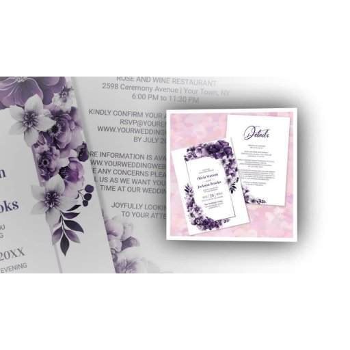 Help your guests find their table with this purple floral seating chart. It is suitable for a wedding with 9 tables and up to 90 guests.