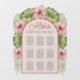 A tropical floral seating chart, appropriate for a Hawaiian wedding / luau. The text is inside a pink arch with burgundy red borders. Around the arch, there are tropical flowers and leaves - monstera and palm leaves and pink hibiscus - painted in watercolor. The title "Aloha" is written in handwriting script, in a burgundy red similar in colour with the centre of the hibiscus flowers, the rest of the text is black (all caps).