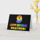 The front of this cheerful, colourful, and fun birthday greeting card design features a large number "9" and the message "HAPPY BIRTHDAY,", both having a rainbow spectrum gradient inspired pattern colouring, along with a bold yellow customisable recipient name. The front also has a minimalist, simple, black coloured background. The inside features a customised birthday greeting message, or could perhaps be cleared and left blank if a message is to be written by hand instead. A colourful customisable birthday card like this might be a fun way to acknowledge somebody’s ninth birthday. [~Z0000472]