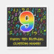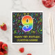 This fun, colourful, and vibrant birthday-themed paper napkin design features a large number "9" having a rainbow spectrum gradient inspired pattern. It also features the message "Happy 9th Birthday,", and a customisable name. Part of the background has a colourful music notes and symbols pattern. Fun, personalised birthday themed paper napkins like this might be used at somebody’s 9th birthday celebration. [~Z0000421]