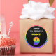 This joyful and upbeat birthday themed round sticker design features a big number “9“ with a vibrant rainbow spectrum inspired gradient pattern, along with the message “HAPPY 9th BIRTHDAY,”, and a personalised recipient name. Stickers like these might be distributed or used at a party held for somebody who is celebrating their 9th birthday, or perhaps used when wrapping gifts/presents or preparing invitations for such an event. [~Z0000637]