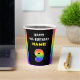 This fun and cheerful birthday themed paper cup design features a big number “9“ having a vibrant rainbow spectrum inspired gradient pattern, along with the message “HAPPY 9th BIRTHDAY,”, and a custom recipient name. Birthday themed paper cups like this might be used at a party celebrating somebody’s ninth birthday. [~Z0000639]