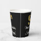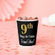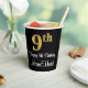 This stylish, elegant, and sophisticated birthday themed paper cup design features a large ordinal number “9th” having an imitation/faux gold-like gradient pattern, along with the birthday greeting message “Happy 9th Birthday,” and a custom name in a script-style font. The background is coloured black. Luxurious birthday themed paper cups like this might be used at a birthday party in celebration of somebody’s ninth birthday. [~Z0000538]