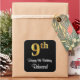 This elegant, sophisticated, and stylish birthday themed sticker design features a large ordinal number “9th” having an imitation/faux gold-inspired appearance, in addition to the birthday greeting message “Happy 9th Birthday,” and a customisable name in a script-style font. The background is coloured black. Luxurious birthday-themed stickers like this might be used when giving a gift or present in celebration of somebody’s ninth birthday, or perhaps may be handed out to the attendees at a birthday party or celebration. [~Z0000517]