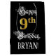This elaborate and opulent birthday giftbag design features the message “Happy 9th Birthday,”, along with a personalised recipient name. Part of the message is in a luxurious script-style text, the large number “9th” features a faux/imitation gold-inspired look pattern, and the background is coloured black. An elegant gift-bag like this might be a respectable way of wrapping a birthday present or gift being given to somebody who is celebrating their ninth birthday. [~Z0000560]